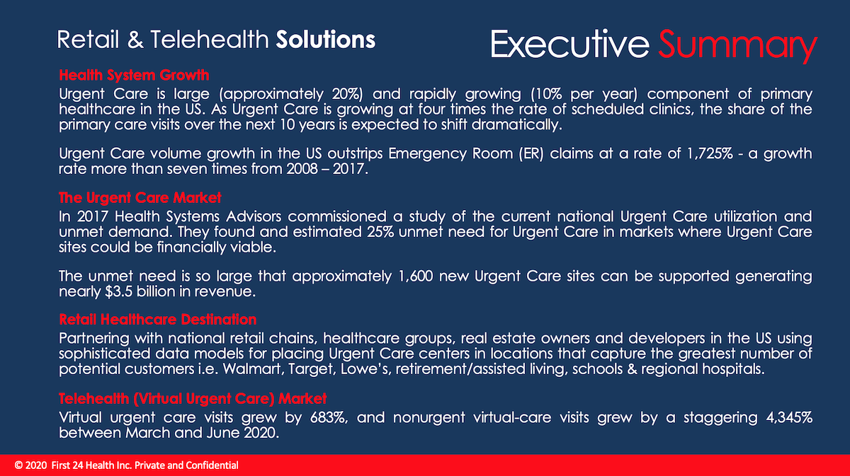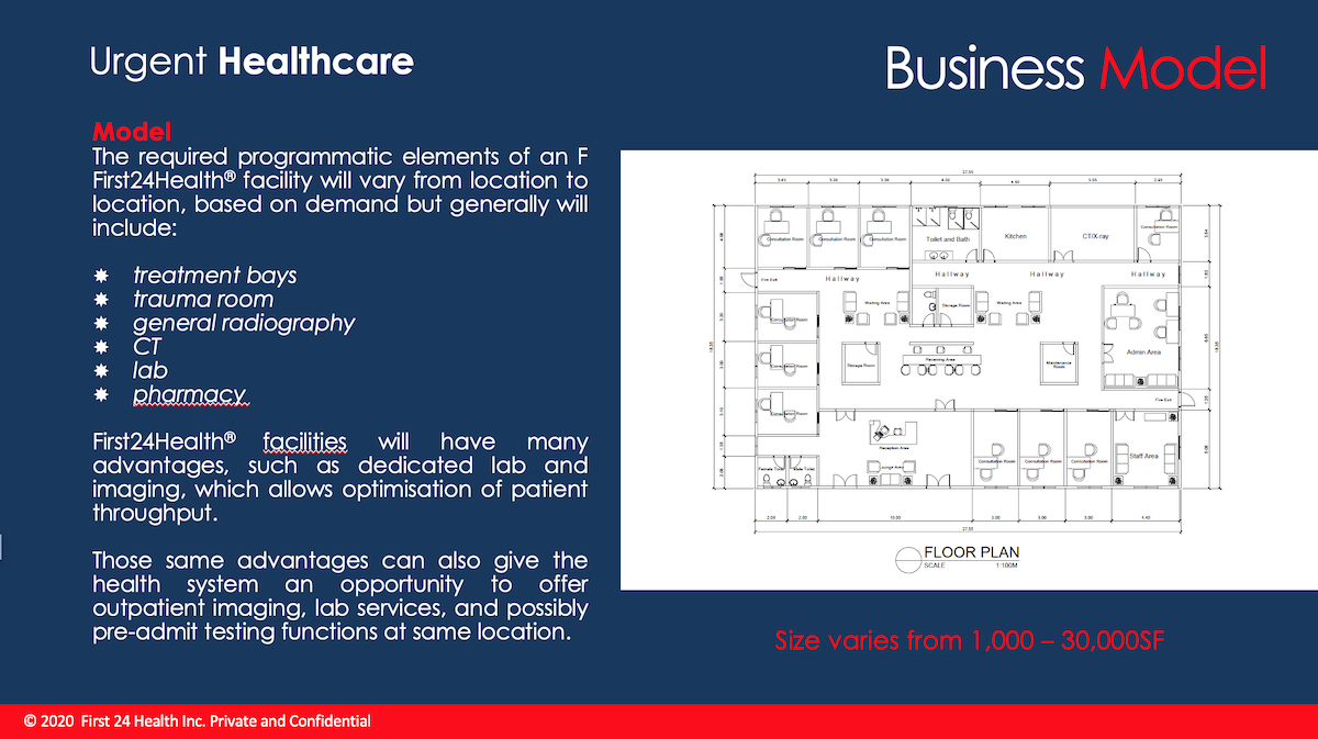 As part of the growth model First24Health intends acquiring existing Urgent Care facilities and rebranding under First24Health.