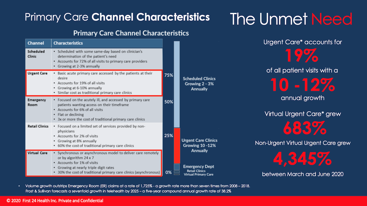 Urgent Care is large (approximately 20%) and rapidly growing (10% per year) component of primary healthcare in the US. As Urgent Care is growing at four times the rate of scheduled clinics, the share of the primary care visits over the next 10 years is expected to shift dramatically.